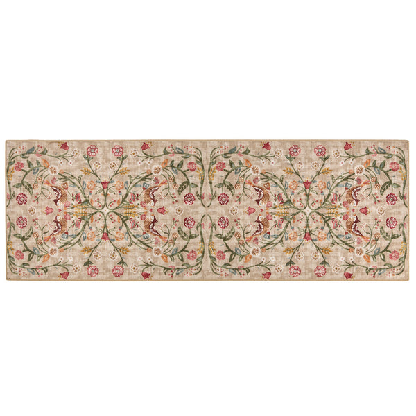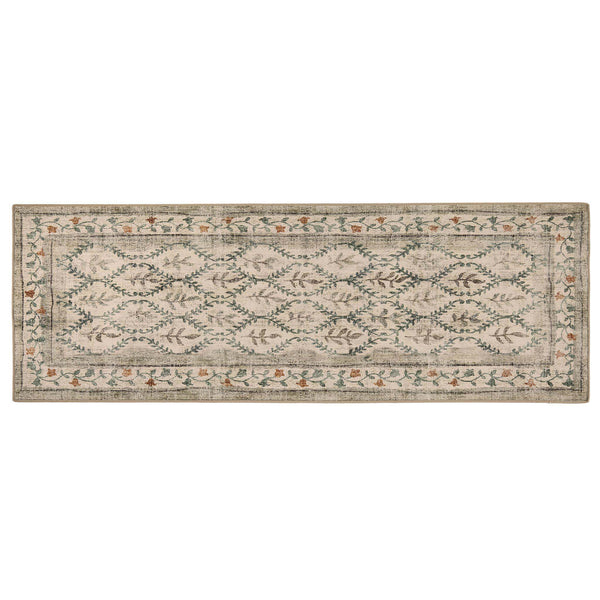 The English Garden rug, has vines, with leaves that create a repetitive tile effect around leaves in tones of green and brown, all surrounded by a botanical inspired border, on a beige background.