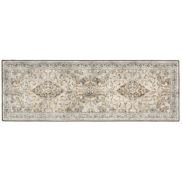 Our Baroque rug has a light grey background with a classic baroque inspired design in a dark grey, with gold accents.
