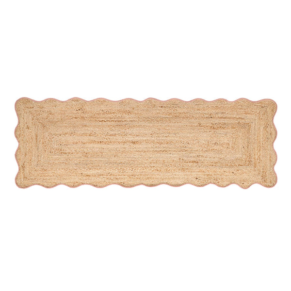 This contemporary rug is crafted from 100% jute and finished with a peach wool-bound edging that adds a refined touch to its natural texture. Handwoven in India by skilled artisans, it features a scalloped border and a rectangular pattern.